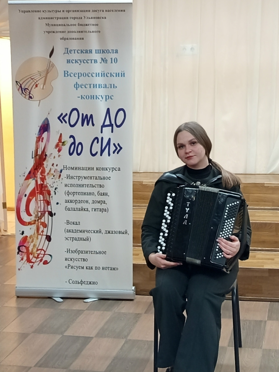 1 февраля на базе детской школы искусств №10 (г.Ульяновск) прошёл I Всероссийский фестиваль-конкурс "От ДО до СИ". В жюри конкурса вошли преподаватели высших категорий детских школ искусств г.Ульяновска. Участницей конкурса от Радищевской детской школы искусств стала выступившая в номинации "Народные инструменты" учащаяся народного отделения Дарья Протопопова (преподаватель С.В.Букина), которая исполнила 2 разнохарактерных произведения. По итогам своего выступления Дарья стала лауреатом конкурса III степени и получила от организаторов конкурса памятную медаль. | |